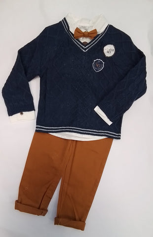 Cable Jumper and trousers comes with a shirt that buttons underneath for smaller sizes and bow tie